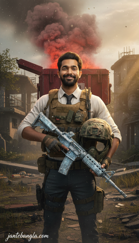 PROMPT: [CRITICAL IDENTITY LOCK] Use the uploaded photo as the ONLY facial reference. Face must remain exactly identical, showing a confident smirk. No face alteration. CONCEPT: ULTRA-REALISTIC 8K BATTLE ROYALE SURVIVOR. SUBJECT: The man is holding a Level 3 helmet under one arm so his face is clearly visible. In his other hand, he holds a highly detailed M416 assault rifle with the legendary icy Glacier skin. He wears a classic white shirt and dark tie tactical outfit. SCENE: Erangel map background with a smoking red airdrop crate behind him. LIGHTING: Golden hour sunlight, gritty realism, smoke and dust in the air. Add signature ‘jantebangla.com’ at the bottom-left corner.