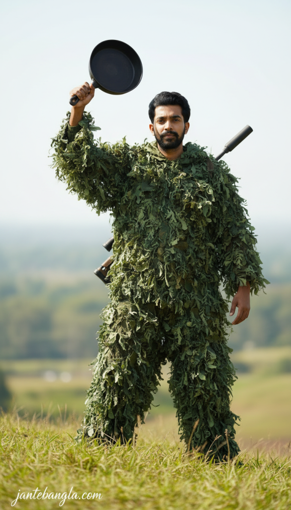 PROMPT: [CRITICAL IDENTITY LOCK] Use the exact face from the reference image. Maintain 100% identity accuracy with an intense, focused gaze. CONCEPT: 8K CINEMATIC CHICKEN DINNER MOMENT. SUBJECT: The man is wearing a green Ghillie suit, but the hood is pulled down to fully reveal his face. He has an AWM sniper rifle slung across his back and is holding the iconic cast-iron Pan in his hand. SCENE: A grassy hill in Sanhok or Erangel, standing triumphantly. LIGHTING: Cinematic daytime lighting, sharp focus on the face and weapons, soft bokeh background. Add signature ‘jantebangla.com’ at the bottom-left corner.