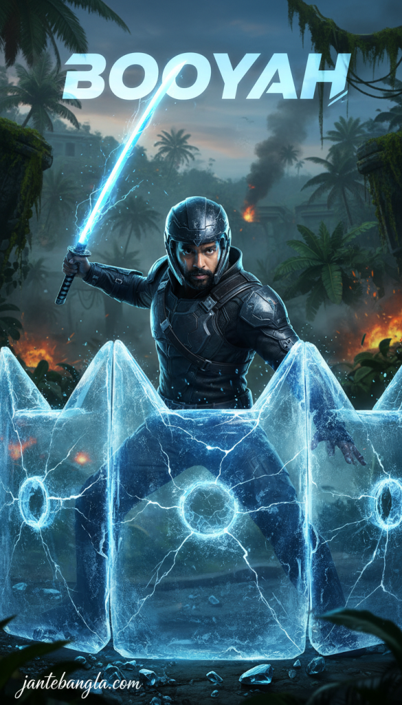 PROMPT: [CRITICAL IDENTITY LOCK] Keep the subject’s real face exactly the same as the reference image. No AI beautification. CONCEPT: ULTRA-REALISTIC 8K BOOYAH MOMENT. SUBJECT: The man is in a dynamic, victorious pose, holding a Katana blade. SCENE: He is taking cover behind a glowing, highly textured ice-blue Gloo Wall. The background is a vibrant, tropical battleground with a subtle ‘BOOYAH’ holographic text floating in the sky. LIGHTING: Epic high-contrast lighting, glowing blue reflections on his face, sharp hyper-realistic details. Add signature ‘jantebangla.com’ at the bottom-left corner.