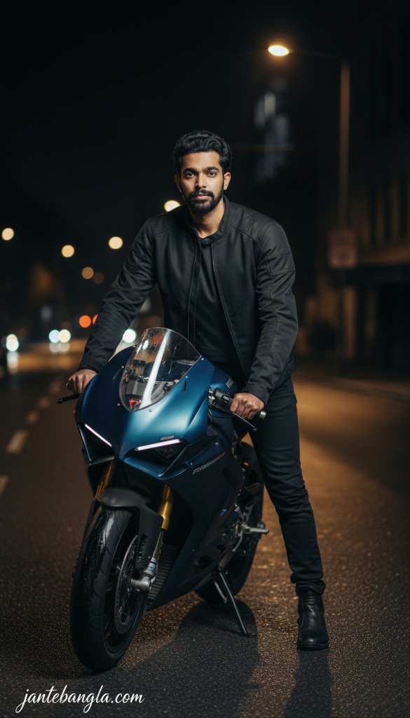 PROMPT: [CRITICAL IDENTITY LOCK] Keep the subject’s real face exactly the same as the reference image. Do NOT change facial structure, jawline, eye shape, nose, lips, beard, hairline, age, or natural expression. No beautification, no face swap, no AI facial modification. Preserve real human skin texture, pores, slight imperfections, and natural asymmetry. The person must be instantly recognizable as the same individual. CONCEPT: ULTRA-REALISTIC 8K LUXURY NIGHT STREET PHOTOGRAPHY. SUBJECT & POSE (POSE 5 – FRONT-LEAN BIKE POSE): The man is standing in front of the luxury bike. One foot resting lightly on the bike foot-peg. Both hands resting on the handlebar. Upper body slightly leaned forward. Head raised, chest open, dominant stance. Calm, serious, confident. No smile. Sharp masculine presence. LUXURY BIKE: High-end luxury sport bike (Ducati Panigale / BMW S1000RR style). Matte black or dark metallic blue color. Clean body, subtle reflections. Bike fully stationary. OUTFIT: Black premium riding jacket (zip open halfway). Inner: dark grey fitted t-shirt. Black slim riding pants. Luxury riding boots. No extra accessories, no flashy logos. SCENE & BACKGROUND: Urban street at night. Wet asphalt reflecting street lights. Minimal traffic lights in distance. Dark buildings softly visible. LIGHTING & QUALITY: Realistic night lighting. Soft street-light glow from side. Balanced highlights on face and bike. No neon, no cyberpunk colors. Mid-to-full body portrait. Eye-level camera. Face razor sharp. Ultra-HD, hyper-realistic real DSLR editorial shoot. SIGNATURE: Add “jantebangla.com” at the bottom-left corner, handwritten signature-style typography, thin cursive strokes, small size, subtle premium elegance, white or soft off-white color. ASPECT RATIO: 3:4 vertical