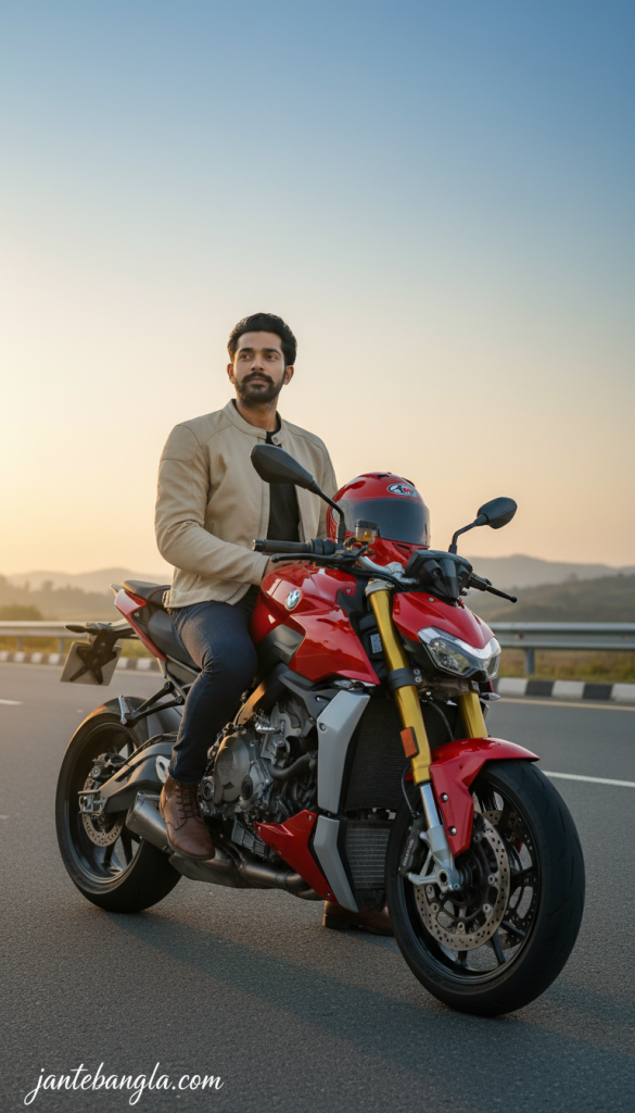 PROMPT: [CRITICAL IDENTITY LOCK] Use the exact same face from the reference image. No reshaping, no smoothing, no beauty filter, no AI alteration. Keep real skin texture, pores, beard detail, eye shape, and expression unchanged. CONCEPT: ULTRA-REALISTIC 8K LUXURY SUNRISE LIFESTYLE SHOOT. SUBJECT & POSE (POSE 6 – SEATED ON BIKE, RELAXED): The man is sitting on the luxury bike. One foot on the ground, other on the foot-peg. One hand resting on the fuel tank. Other hand holding helmet at side. Back straight, relaxed confidence. Peaceful, confident, composed. Eyes looking slightly toward horizon. No forced smile. LUXURY BIKE: Premium naked luxury bike (BMW M-series / Ducati Streetfighter style). Glossy red or pearl white color. Clean finish with soft morning reflections. Bike parked on roadside. OUTFIT: Light beige or off-white riding jacket. Inner: black or charcoal tee. Dark riding jeans. Premium boots. Helmet matching bike color. SCENE & BACKGROUND: Open road at sunrise. Soft orange and blue sky. Empty highway stretching behind. Minimal roadside elements. LIGHTING & QUALITY: Natural sunrise light. Warm highlights on face. Soft shadows. True-to-life colors. Full-body cinematic framing. Eye-level camera. Everything in sharp focus. Calm and powerful Ultra-HD DSLR realism. SIGNATURE: Add “jantebangla.com” at the bottom-left corner, handwritten cursive typography, thin strokes, small size, subtle premium elegance, white or soft off-white color. ASPECT RATIO: 3:4 vertical